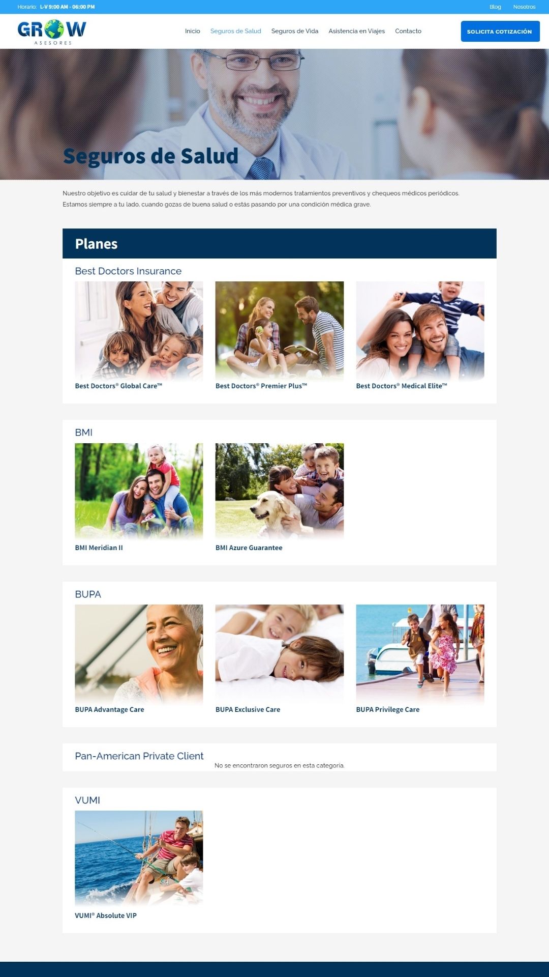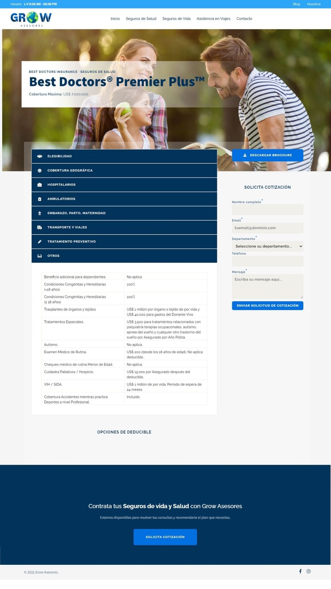 Cada servicio cuenta con una página individual en la que el visitante puede descargar el brochure del servicios, ver los beneficios y cobertura a detalle. Además, cuenta con un formulario de solicitud de cotización que se dirige al equipo de Grow por email, indicando el servicio desde donde se envió el mensaje.