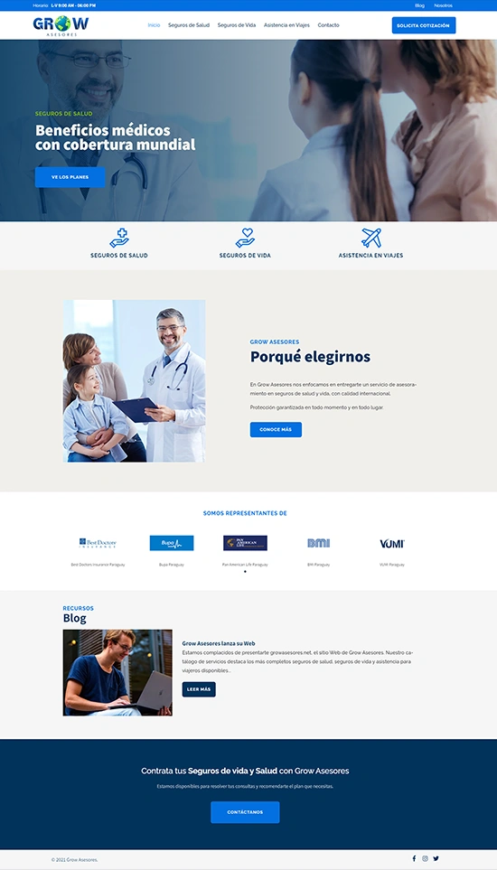 Para Grow Asesores desarrollamos un Sitio Web a medida. Su catálogo de servicios destaca los más completos seguros de salud, seguros de vida y asistencia para viajeros disponibles para Paraguay.